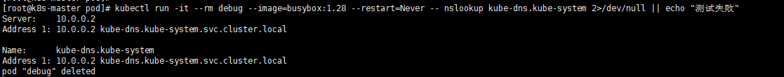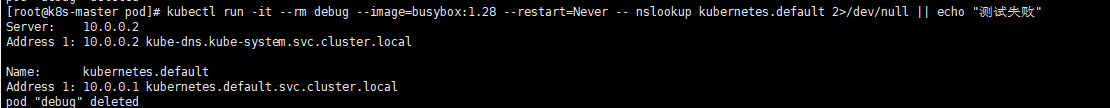 kubectl run -it --rm debug --image=busybox:1.28 --restart=Never -- nslookup kubernetes.default 2>/dev/null || echo "测试失败"