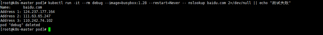 kubectl run -it --rm debug --image=busybox:1.28 --restart=Never -- nslookup baidu.com 2>/dev/null || echo "测试失败"