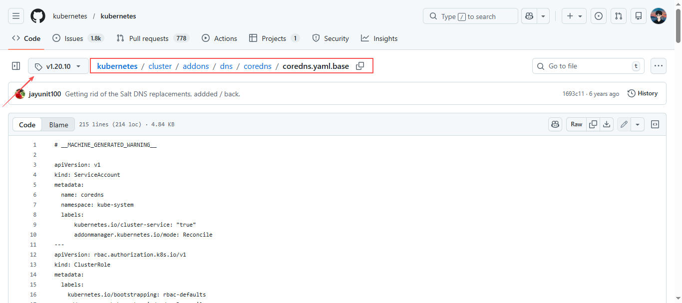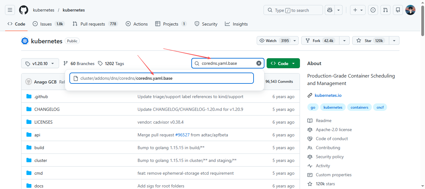 CoreDNS配置可以在Kubernetes官方源码地址找coredns.yaml.base,一般存放地址在源码的cluster/addons/dns/coredns/coredns.yaml.base,官方源码地址:https://github.com/kubernetes/kubernetes,可根据自己的Kubernetes版本找对应tag的coredns.yaml.base,例如我的kubernetes版本是1.20.10,那就找tag的v1.20.10版本:https://github.com/kubernetes/kubernetes/tree/v1.20.10,然后再里面搜索:coredns.yaml.base,进行下载修改即可;